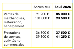 À compter de 2025, la limite de chiffre d’affaires conditionnant le bénéfice de la franchise de TVA est abaissée pour les activités de ventes de marchandises, de restauration et d’hébergement, mais augmentée pour les prestations de services et les activités non commerciales.